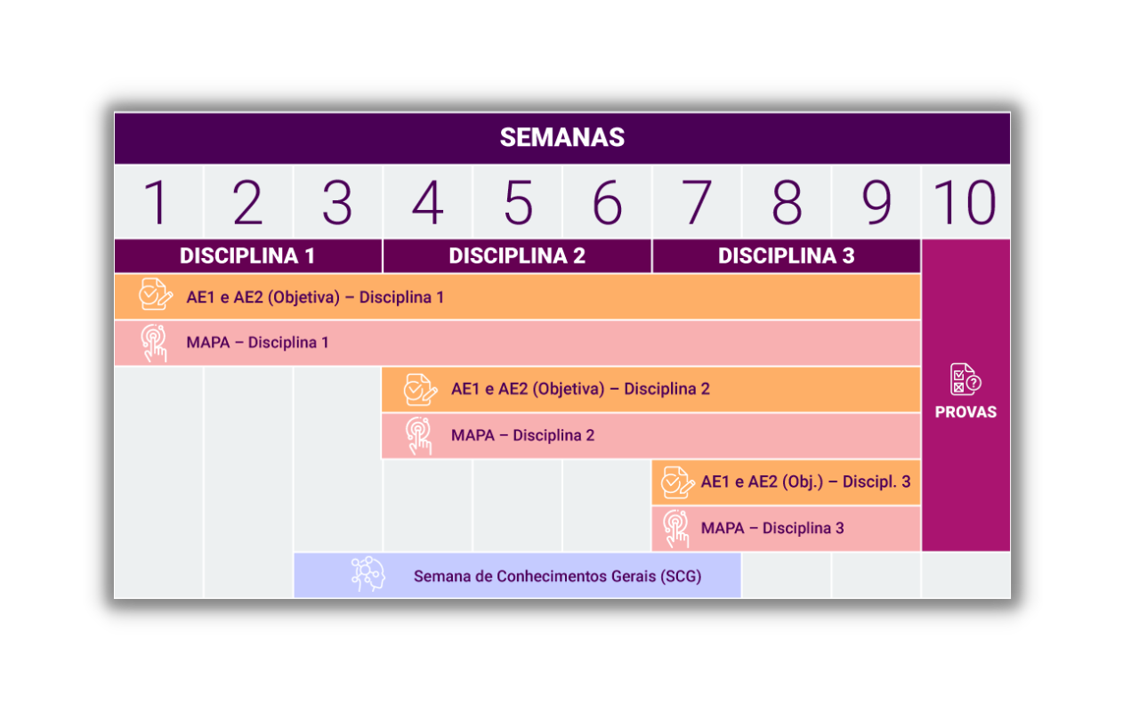 Cada módulo é composto por disciplinas curriculares, distribuídas em dez semanas. Nessas semanas, acontecem os momentos de autoestudo, os interativos e os presenciais obrigatórios.