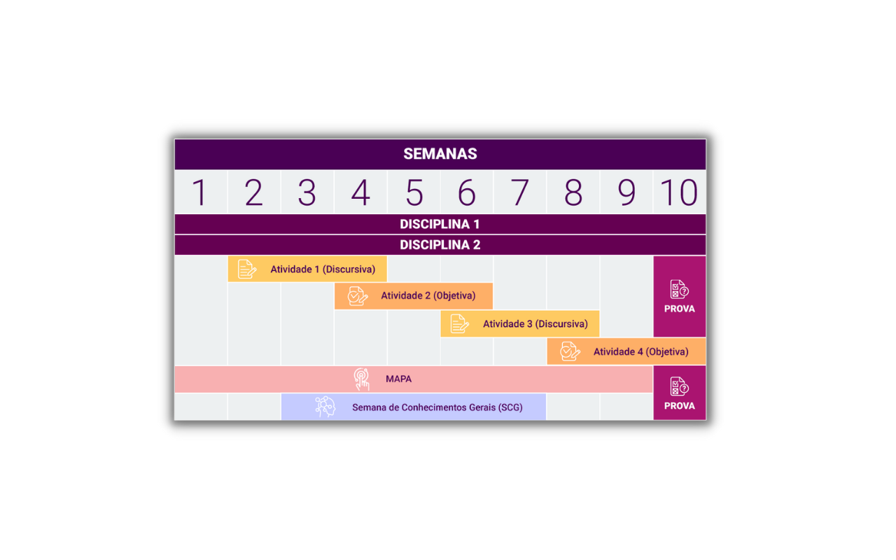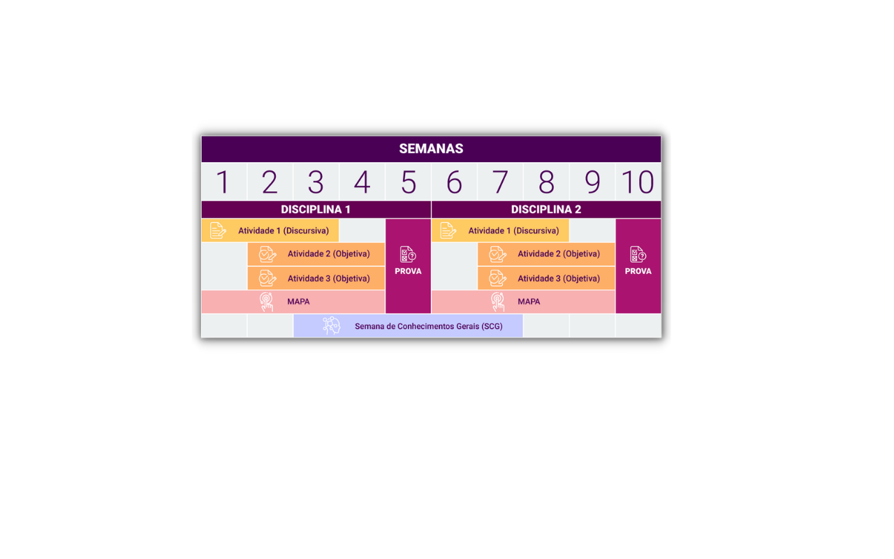 Na metodologia de Educação a Distância (EAD), os alunos dedicam-se a uma disciplina por vez ao longo de um período de 10 semanas. Isso implica em 4 semanas de estudos intensivos para cada disciplina, culminando em uma prova presencial na quinta semana.